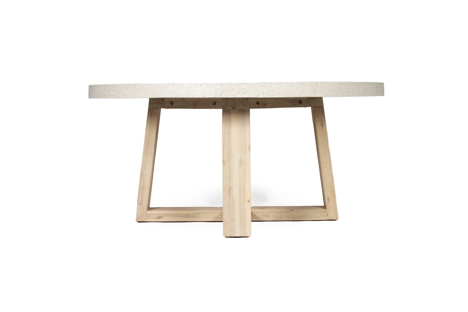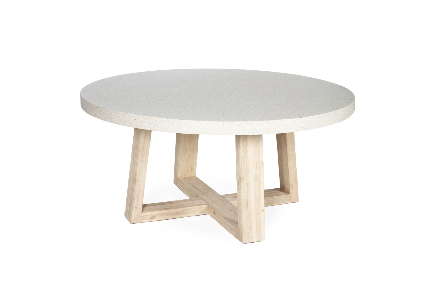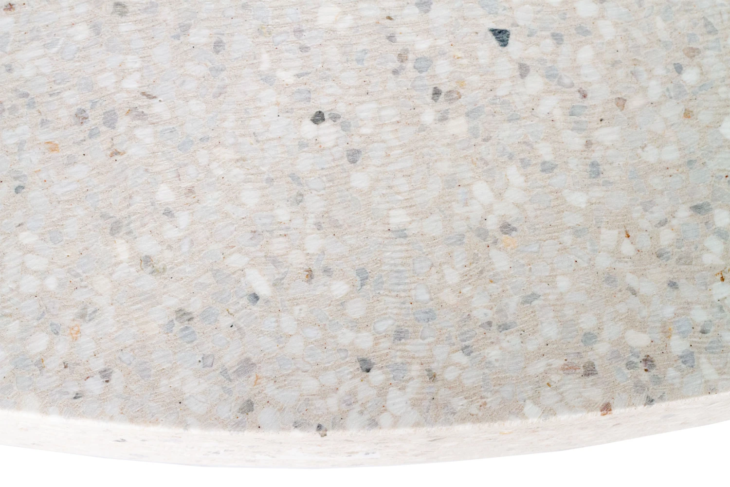 The Round Ivory Coast dining table features a hand polished eTerrazzo Ivory Coast top with extra large handmade Ivory Washed Timber legs. The eTerrazzo features light coloured stones with a few darker stones for added depth. The deceptively simple surface is alive with texture and movement, each table is unique and slightly different to the next.