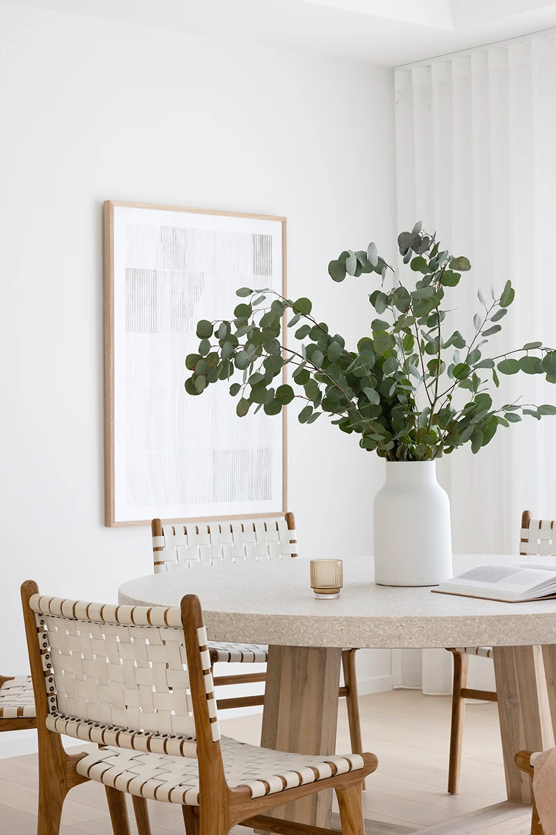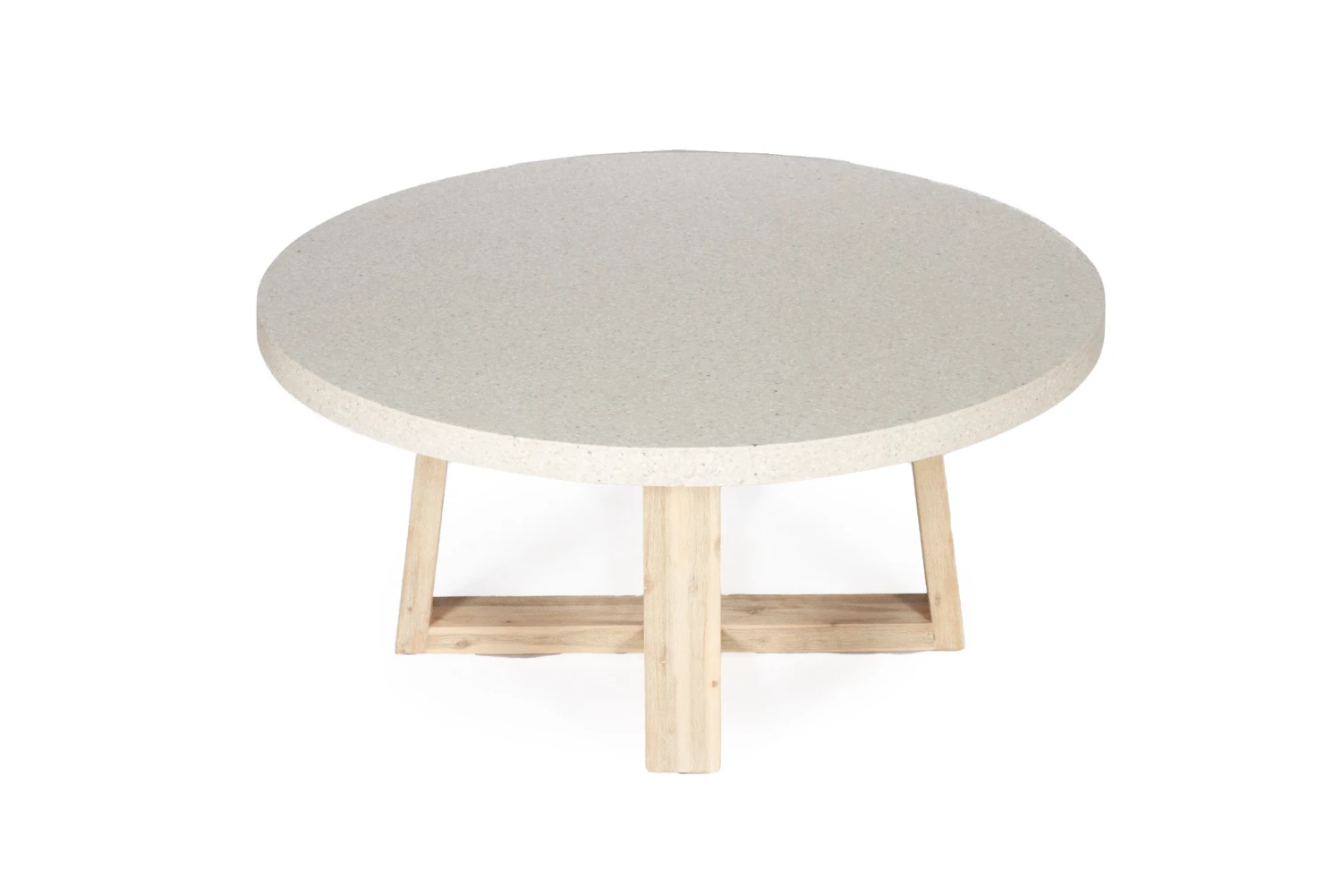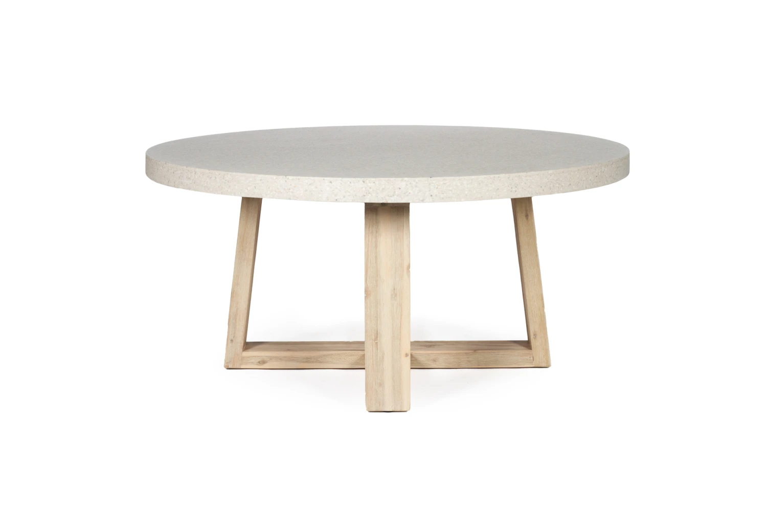 The Round Ivory Coast dining table features a hand polished eTerrazzo Ivory Coast top with extra large handmade Ivory Washed Timber legs. The eTerrazzo features light coloured stones with a few darker stones for added depth. The deceptively simple surface is alive with texture and movement, each table is unique and slightly different to the next.