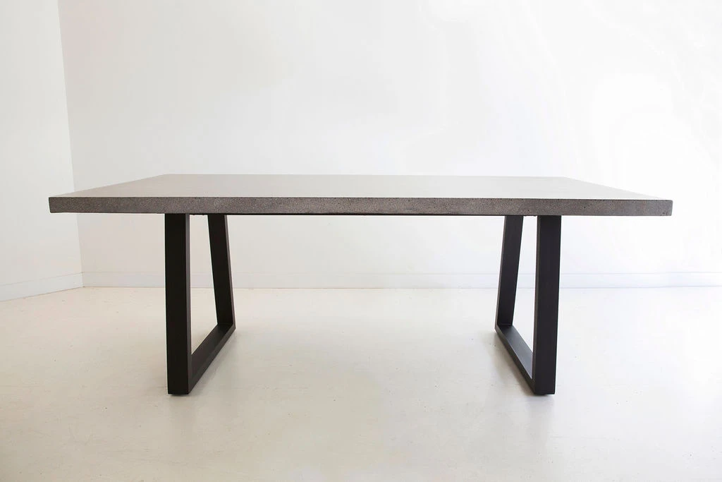 The Sierra dining table features a hand polished Elkstone Speckled Grey top with handmade Black Powder Coated Legs. Deep-dyed and lightly sanded, the deceptively simple surface is alive with texture and movement, each table is unique and slightly different to the next.