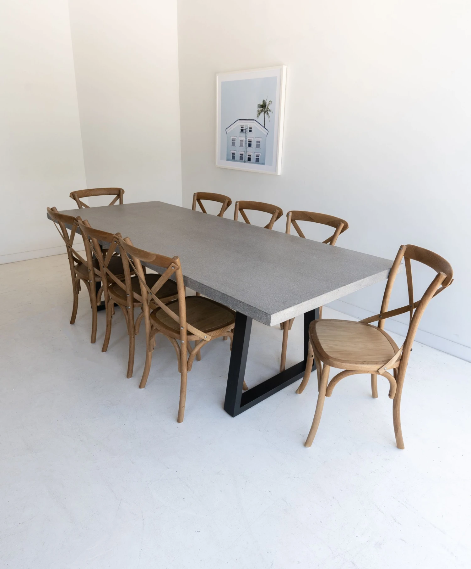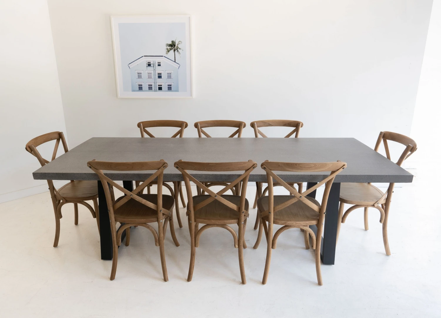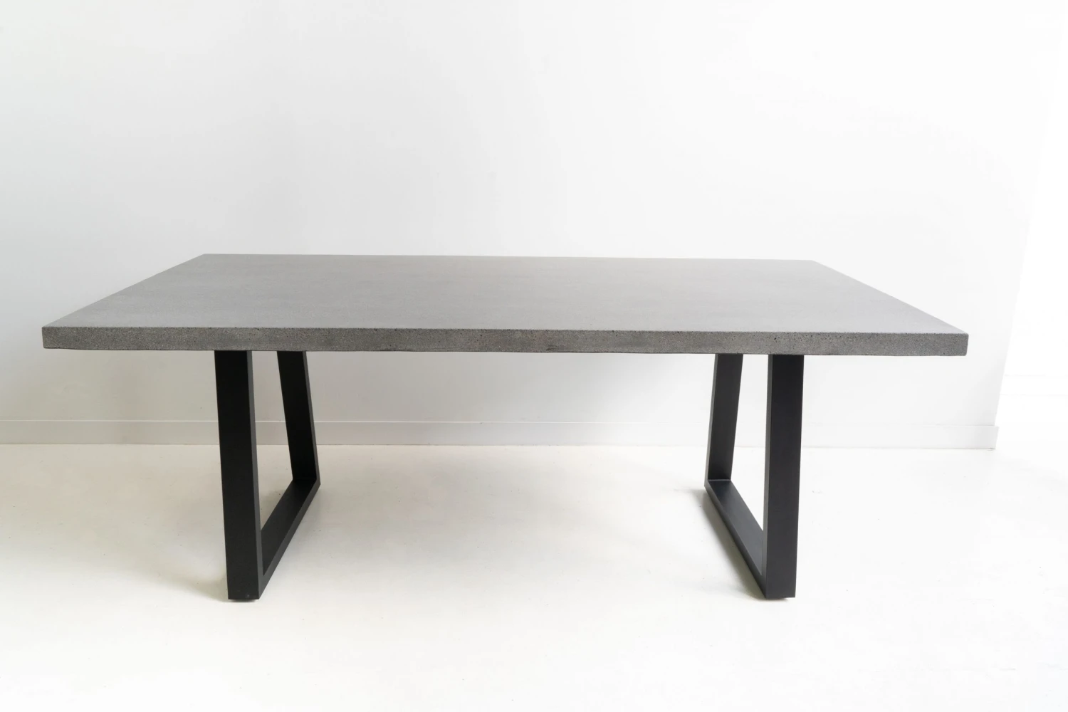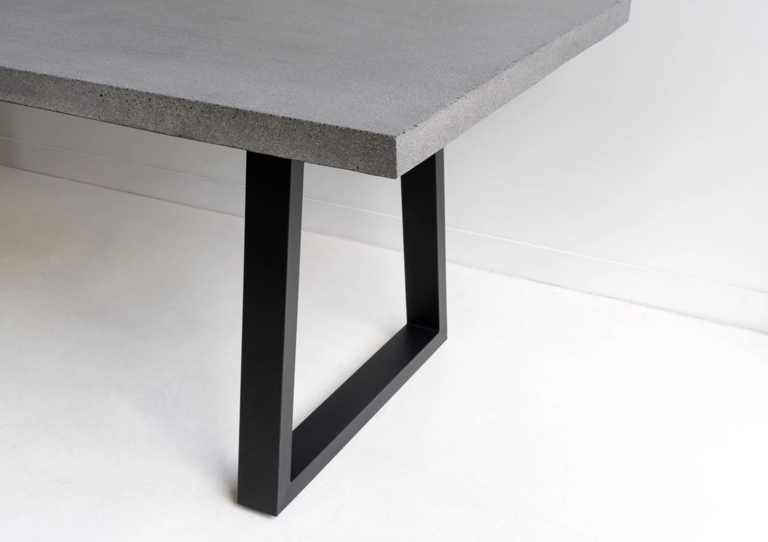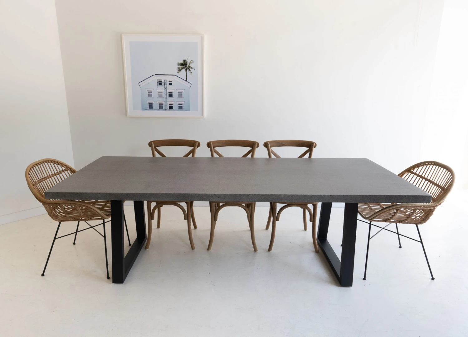 The Sierra dining table features a hand polished Elkstone Speckled Grey top with handmade Black Powder Coated Legs. Deep-dyed and lightly sanded, the deceptively simple surface is alive with texture and movement, each table is unique and slightly different to the next.