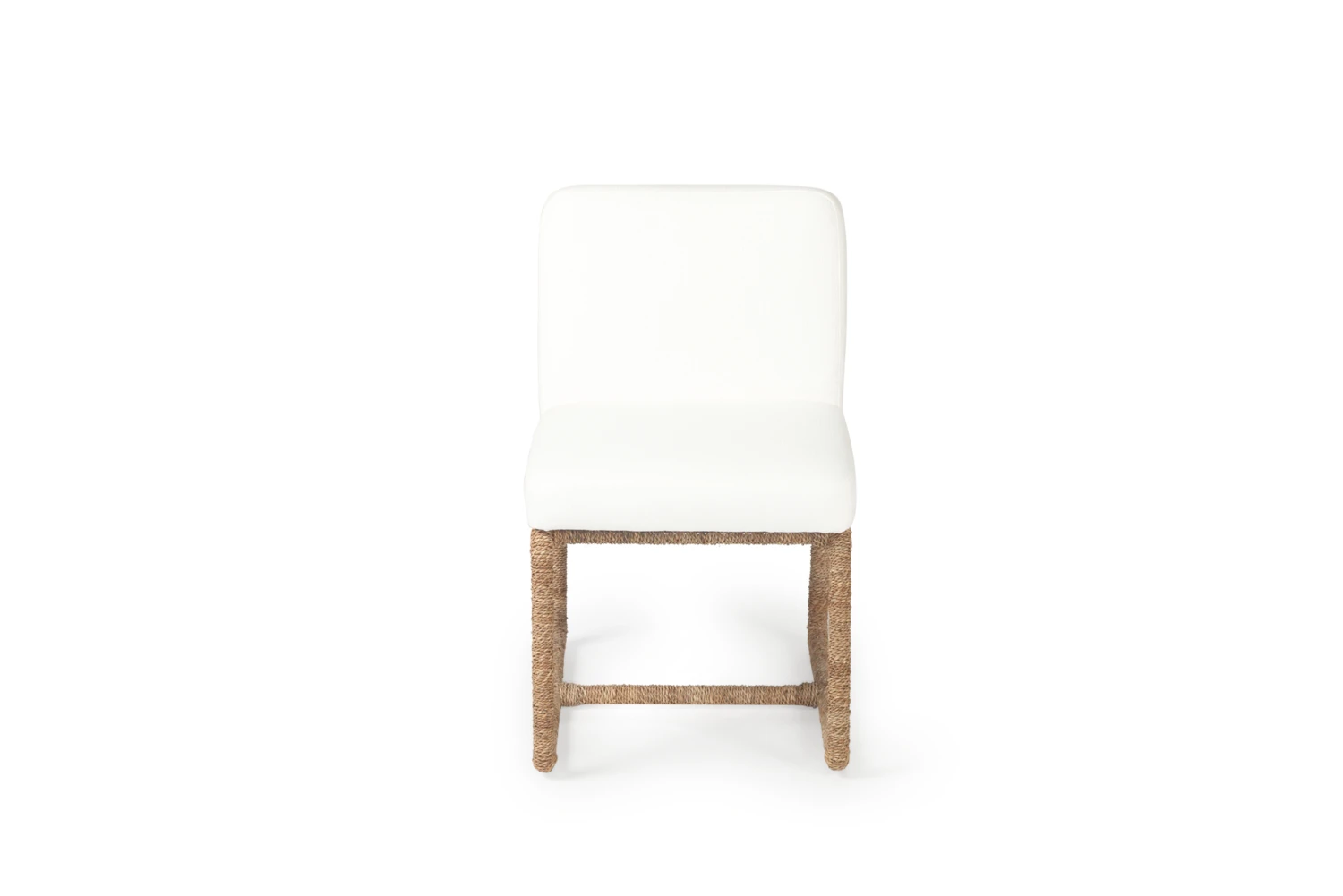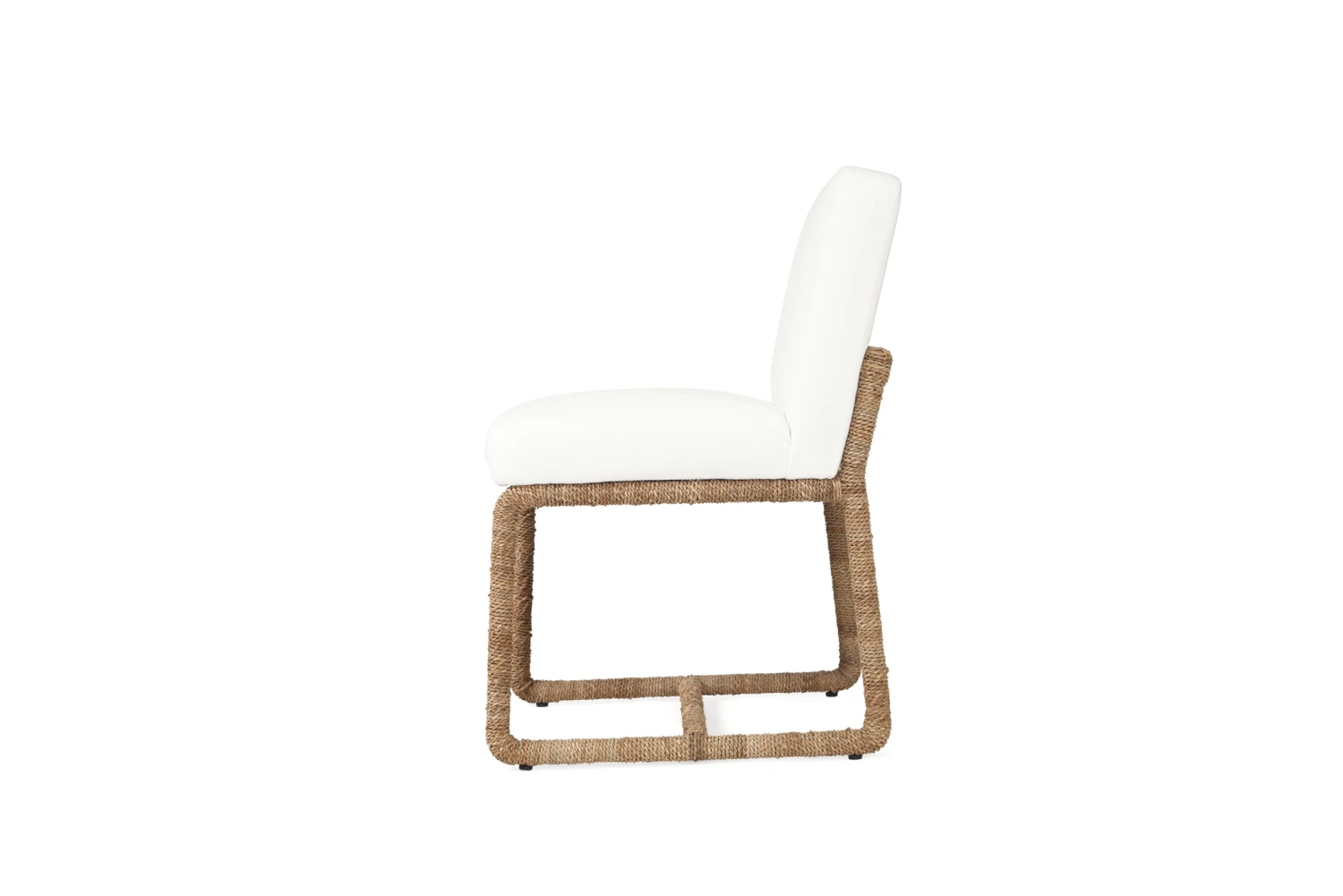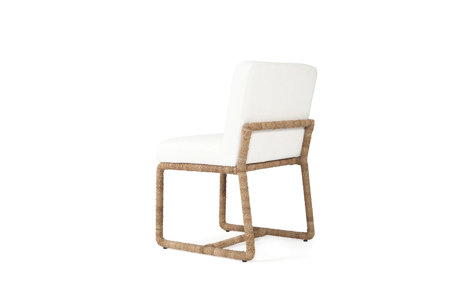 The Coco Dining Chair features a lampakanay rope weave over an aluminium frame with a comfortable white upholstered seat cushion and back.