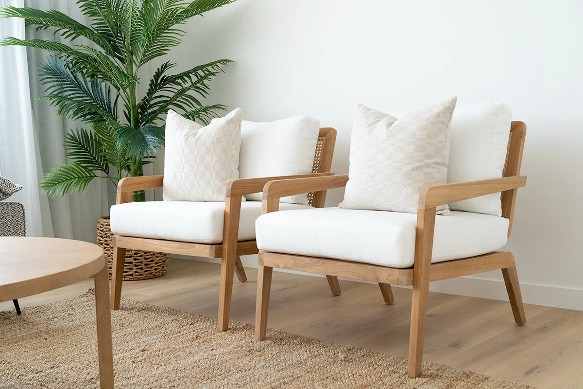 Our Elton Armchair is hand made from sustainably sourced teak with rattan inserts. Finished with Zepel StainGuard upholstery.