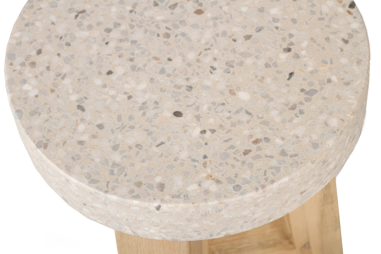 The eTerrazzo stool features a hand polished Elkstone Ivory Coast top with handmade wide Ivory Coast Acacia Wood legs. Deep-dyed and lightly sanded, the deceptively simple surface is alive with texture and movement, each surface is unique and slightly different to the next.