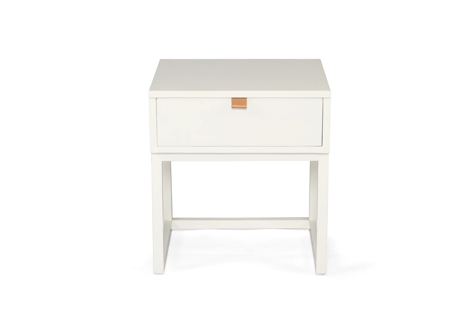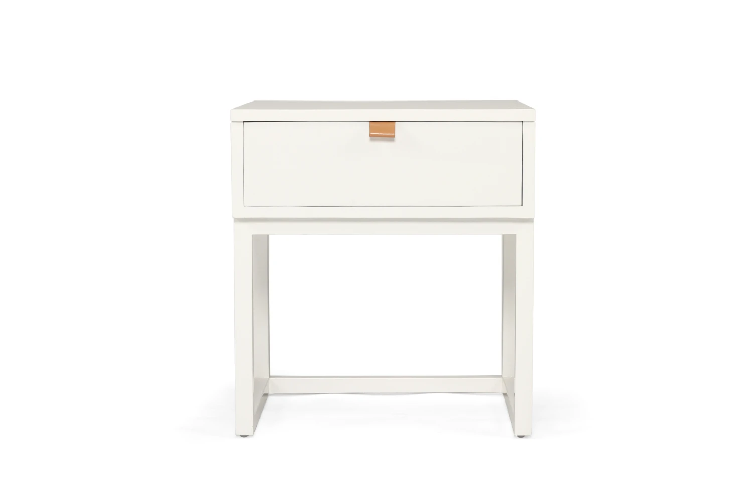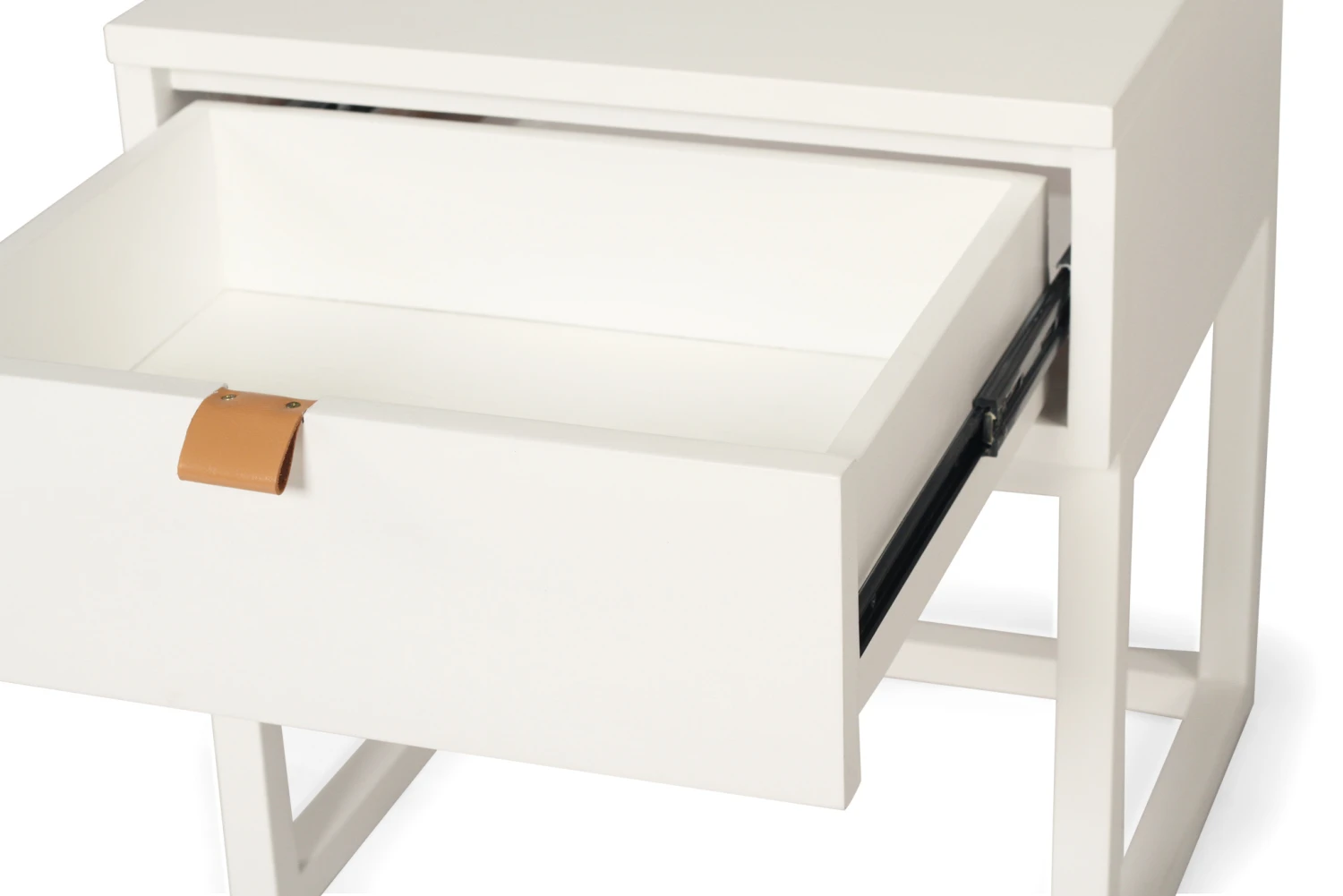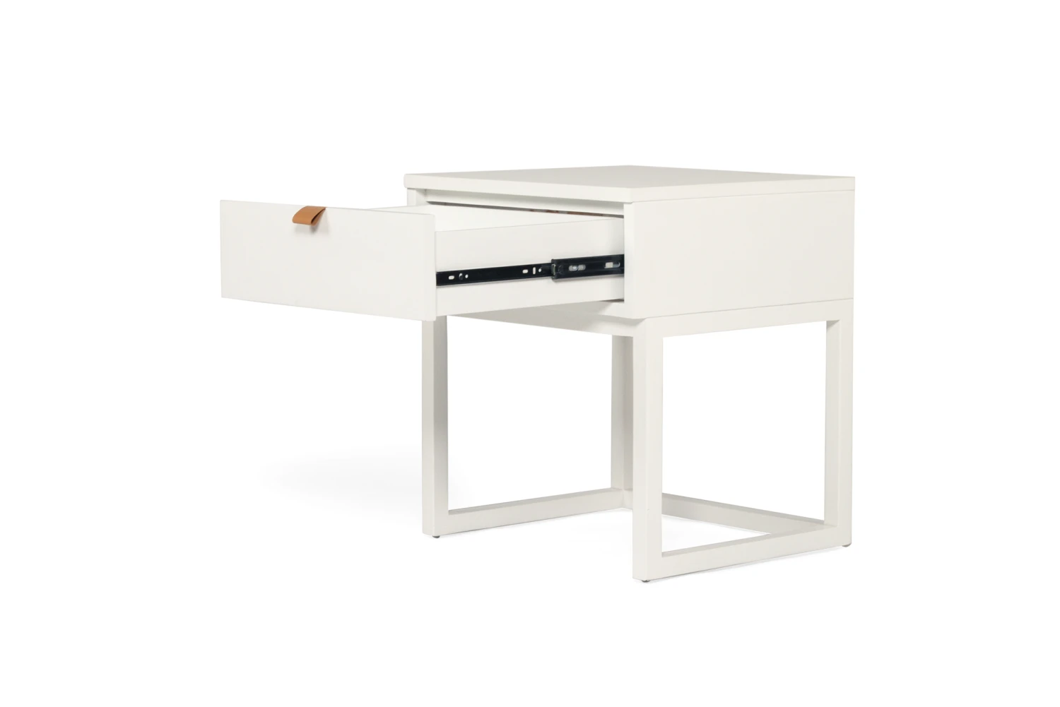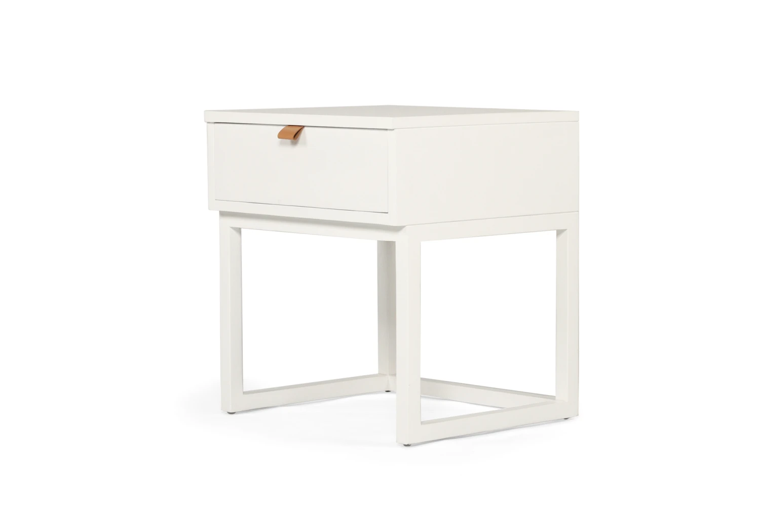 The Flynn Bedside Table is constructed from High Grade Acacia wood and has a smooth white finish. It has 1 opening drawer with a leather pull strap.