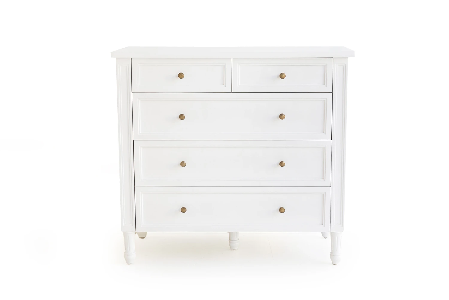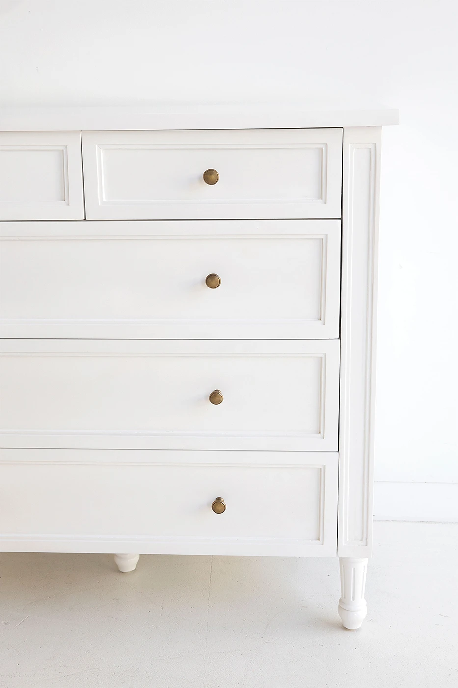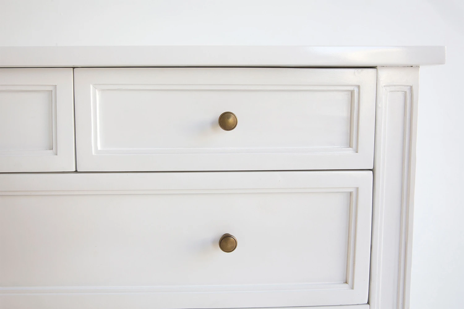 The Hamilton Dresser completes the Hamilton Bedroom Collection by adding the final piece to this popular bedroom puzzle. Made from solid mahogany timber and finished in a White semi gloss finish, this 5 draw unit is solid and unique in its structure and design. This White 5 drawer dresser can stand alone as a beautiful addition to any room or be completely at home when its complimented with a Hamilton bed & bedside tables.