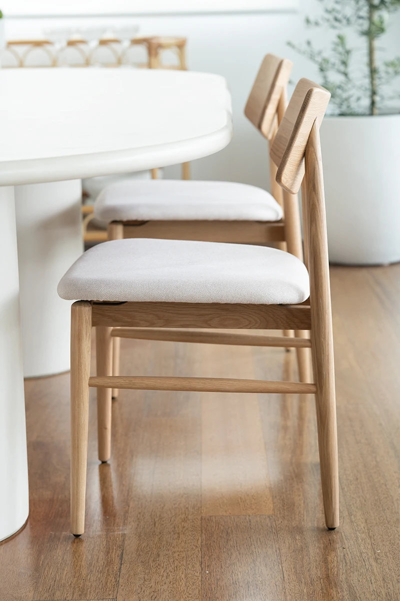 Our Harlow Dining Chair showcases a solid European Oak frame with a removable linen coloured seat cushion.