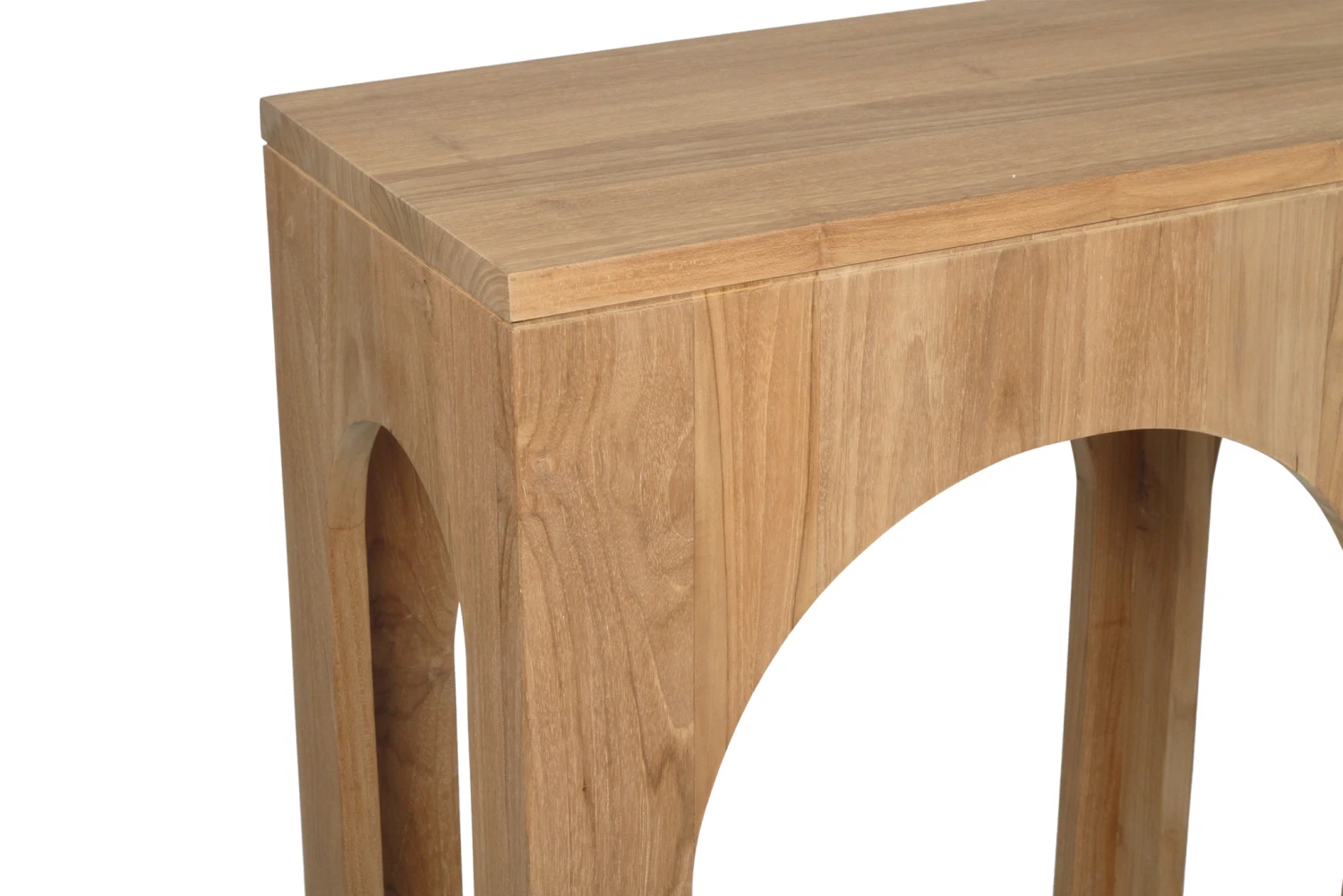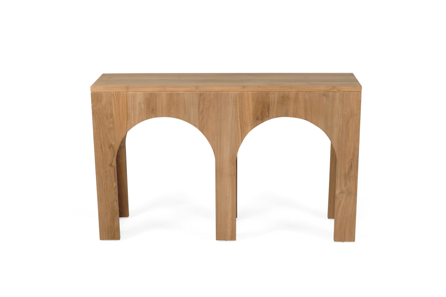 The Isolde Console Table showcases organic hand cut arches set in the the raw beauty of solid handcrafted teak wood.