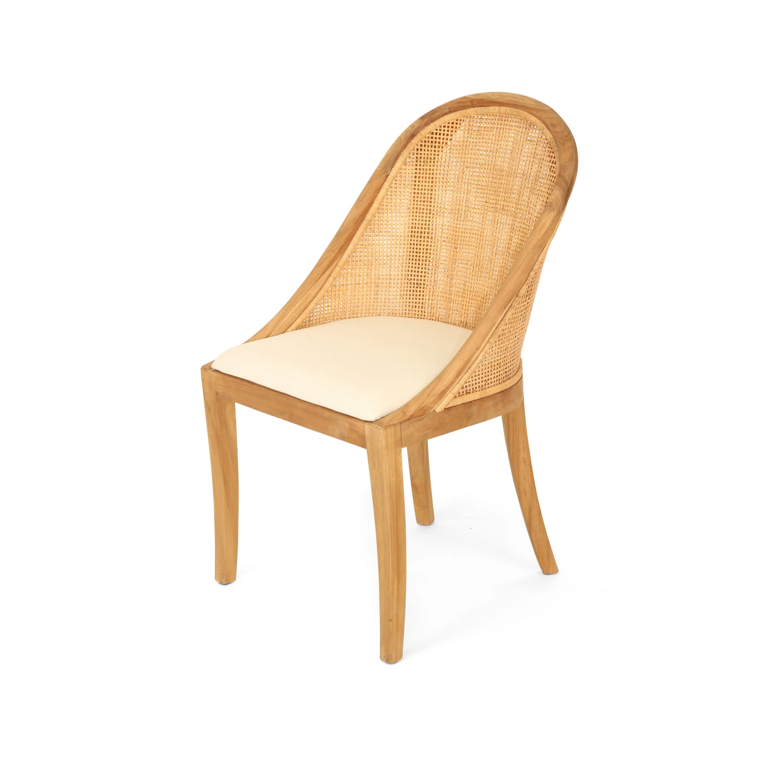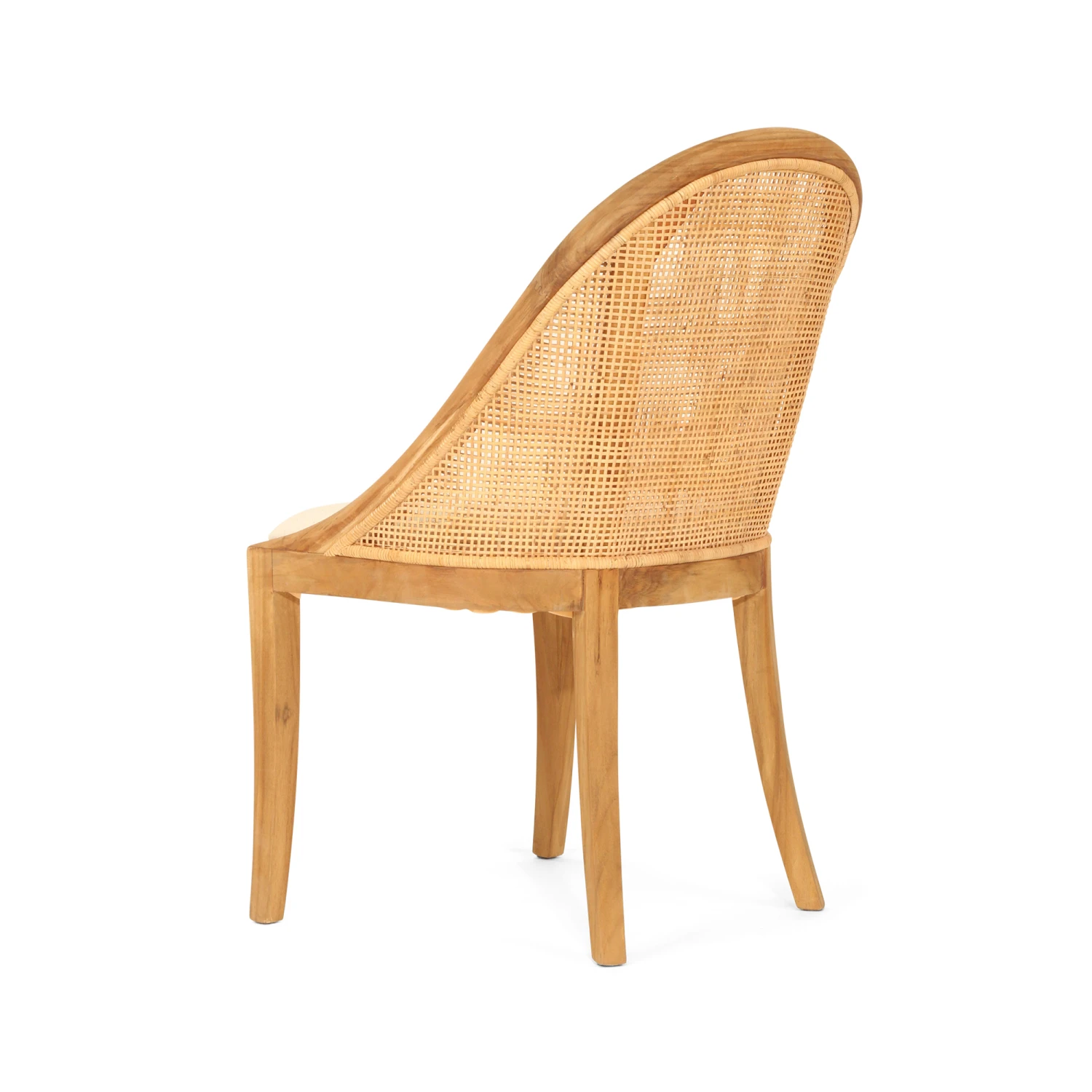 The Marley dining chair, crafted from sustainably sourced teak wood and woven rattan mesh, features an ergonomic design with elegant curves that showcase expert craftsmanship.