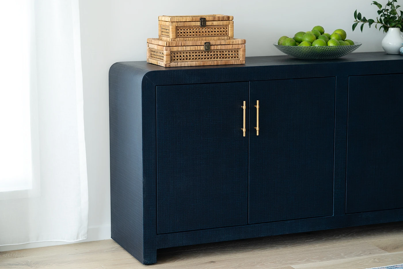 The Newhaven 4-Door Buffet by Serrata Living features a beautiful linen wrap in a painted, lacquered matte finish. With a solid beech frame, the Newhaven 4-Door Buffet is as durable as it is beautiful. Comes fitted with solid brass handles in a brushed finish with soft-close doors.