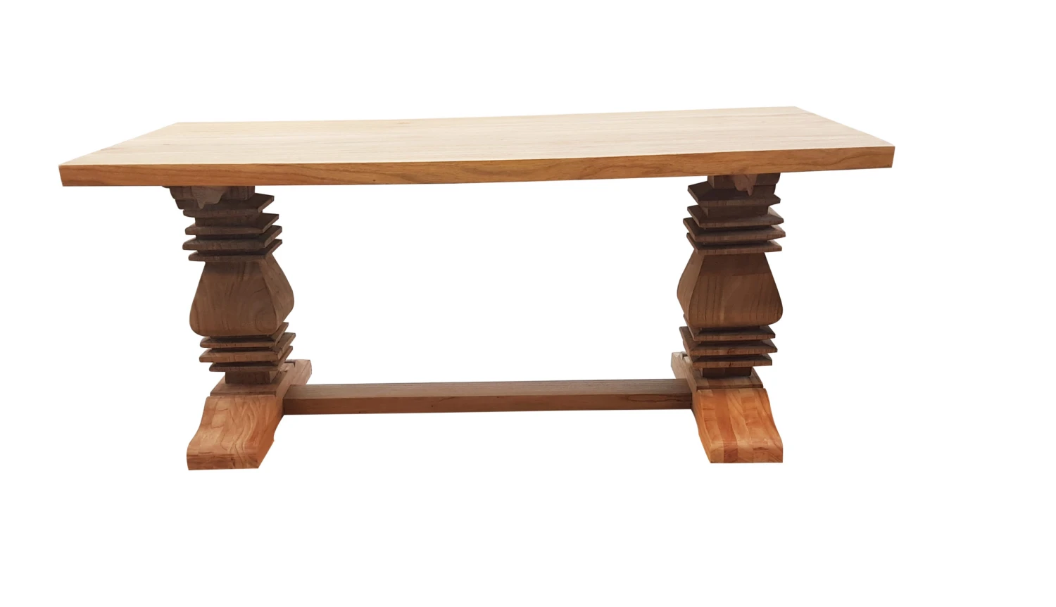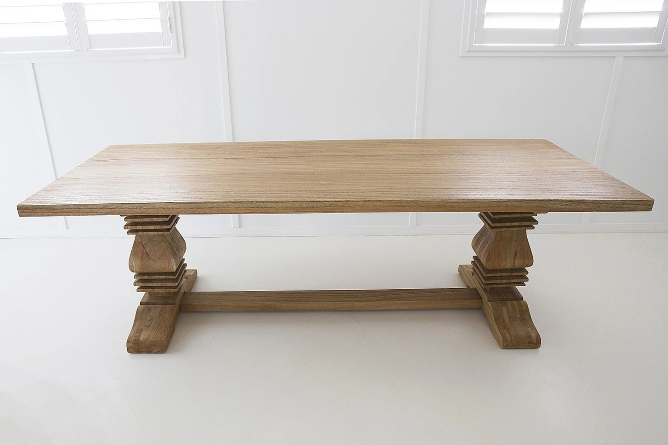 Two pedestal legs, each meticulously carved and strengthened with solid dowels, support a generous solid wood table top finished in a weathered oak stain. Perfect for large gatherings, this table comes in 6 sizes the largest being 3.5 meters.