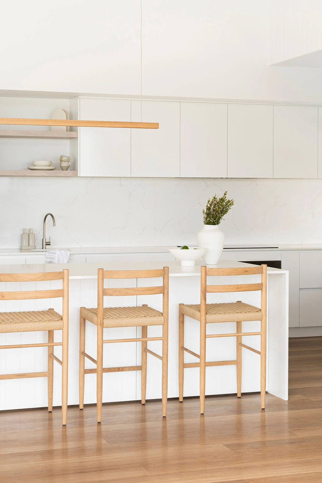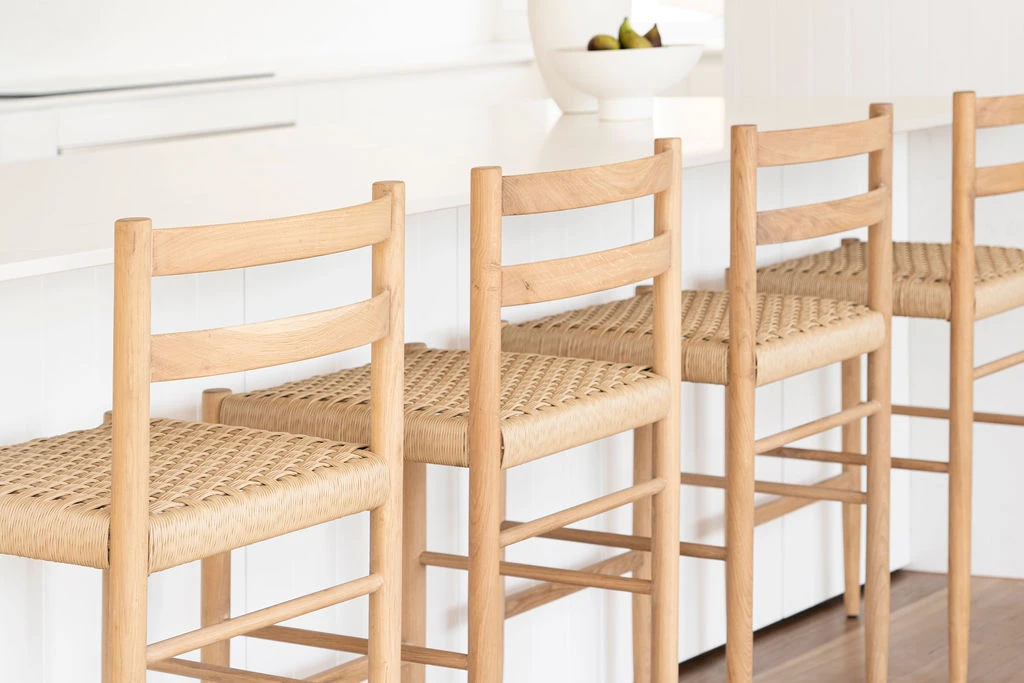 The Oregon Counter Stool showcases a frame and backrest handcrafted form ethically and sustainably sourced 100% American Oak, supporting a coastal inspired woven seat.