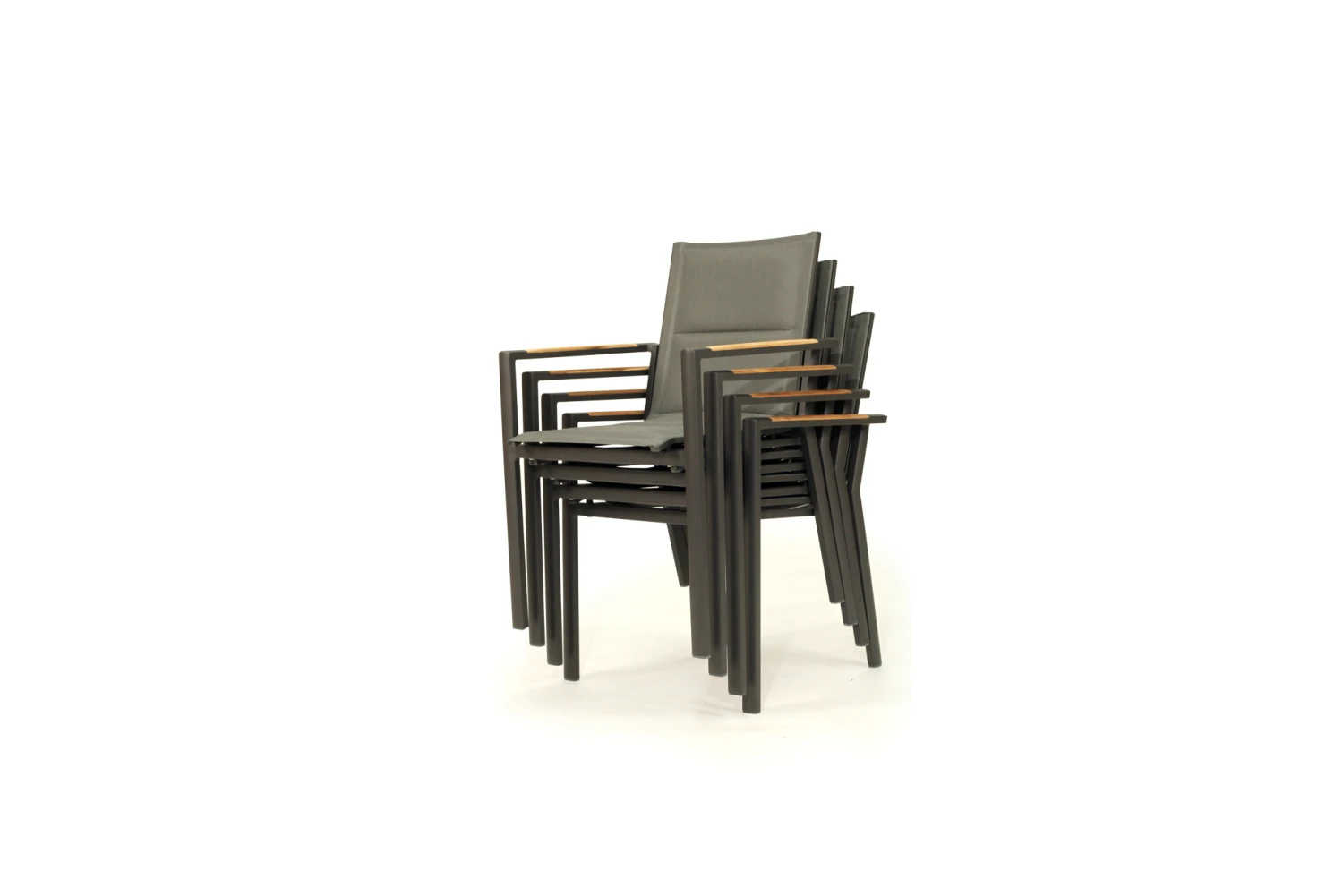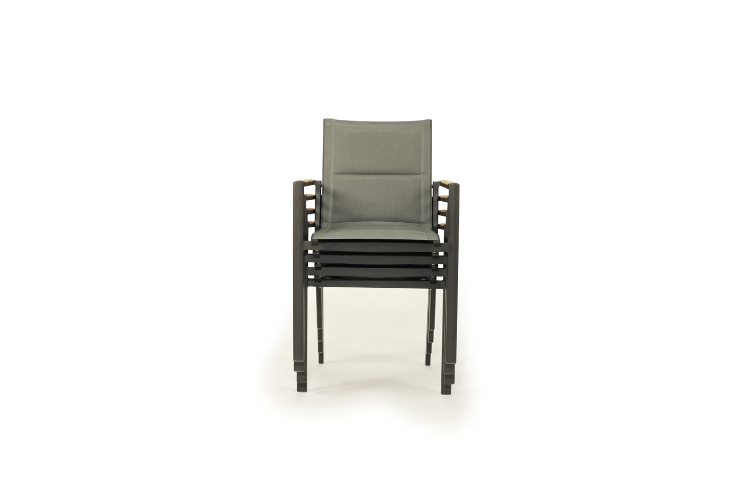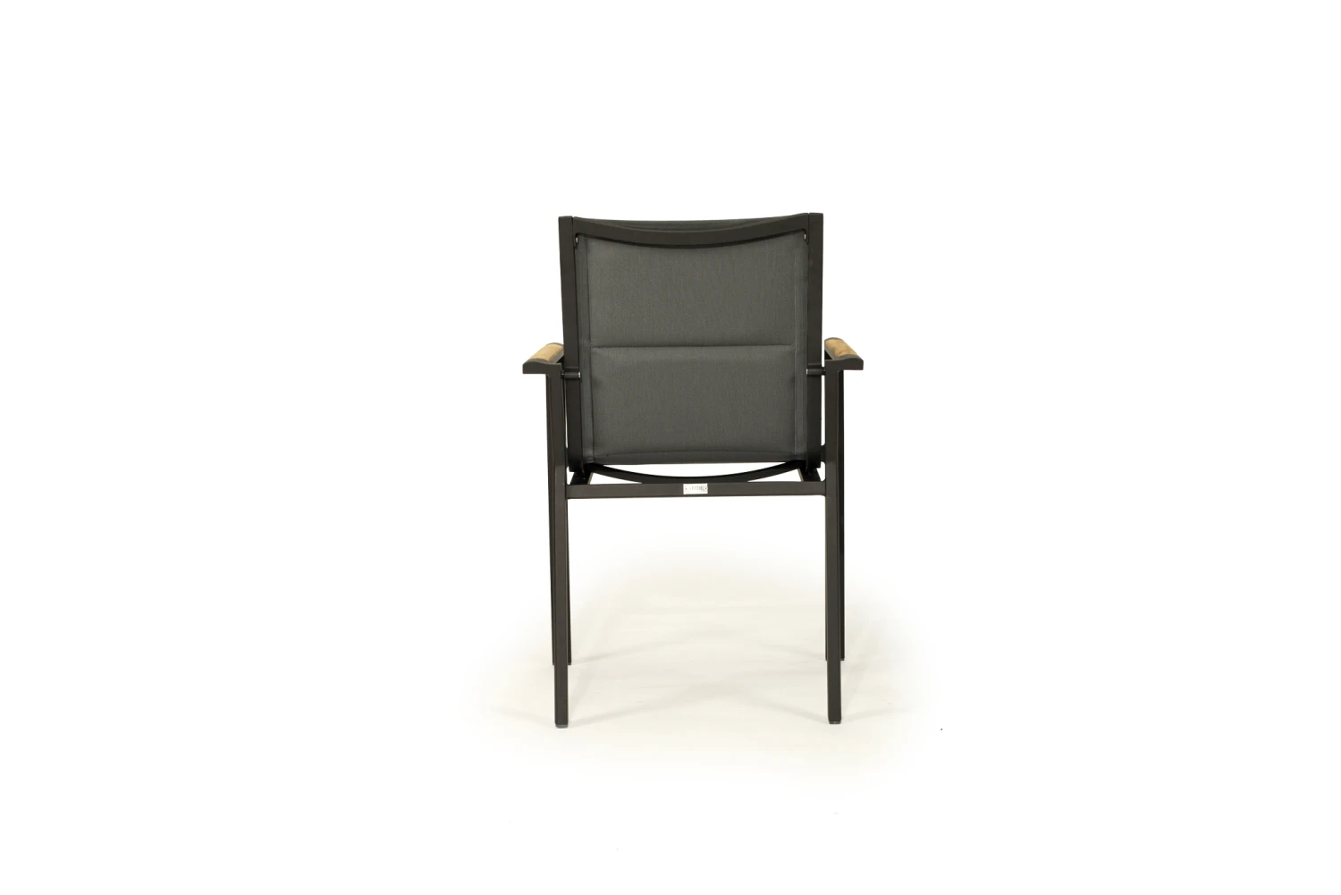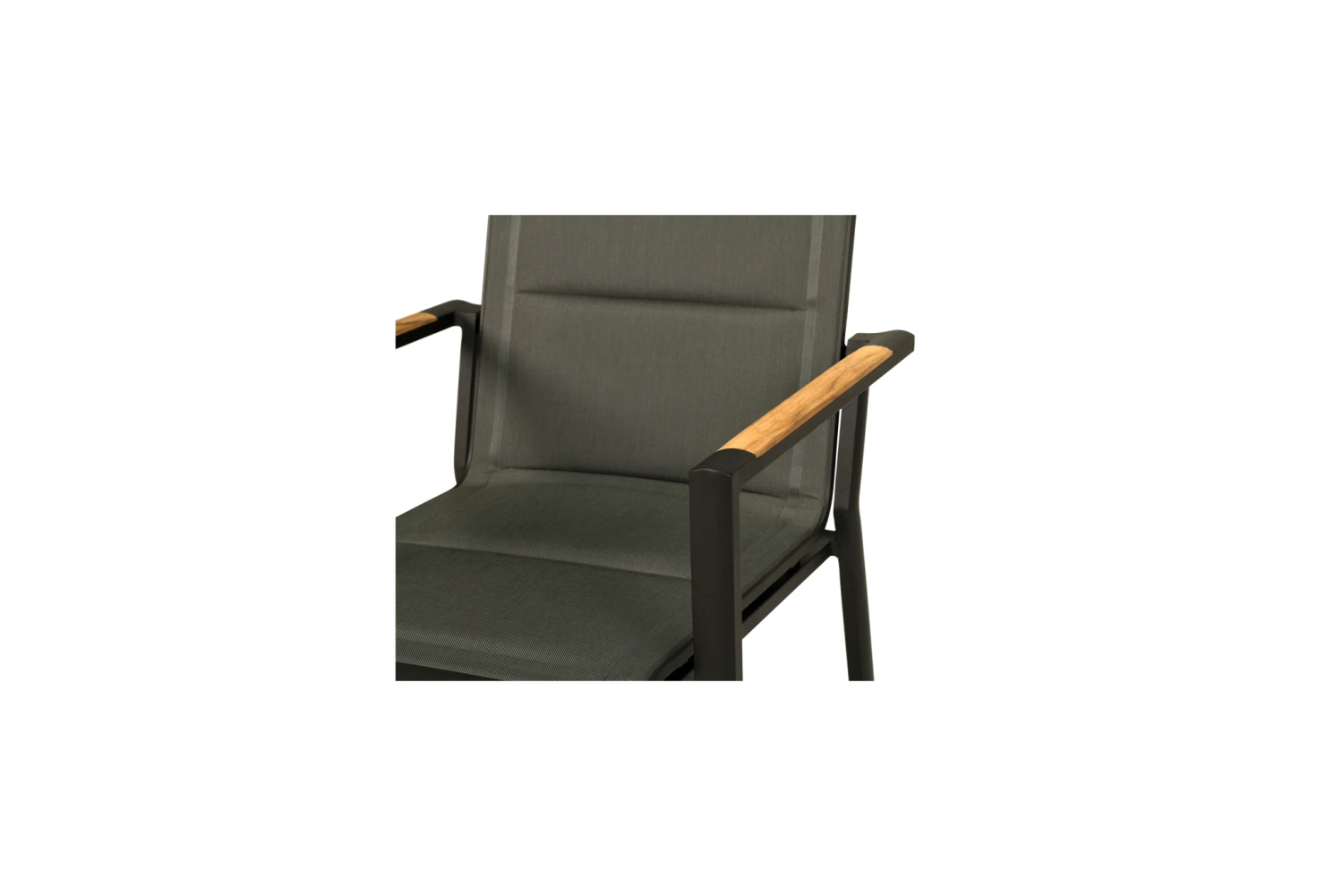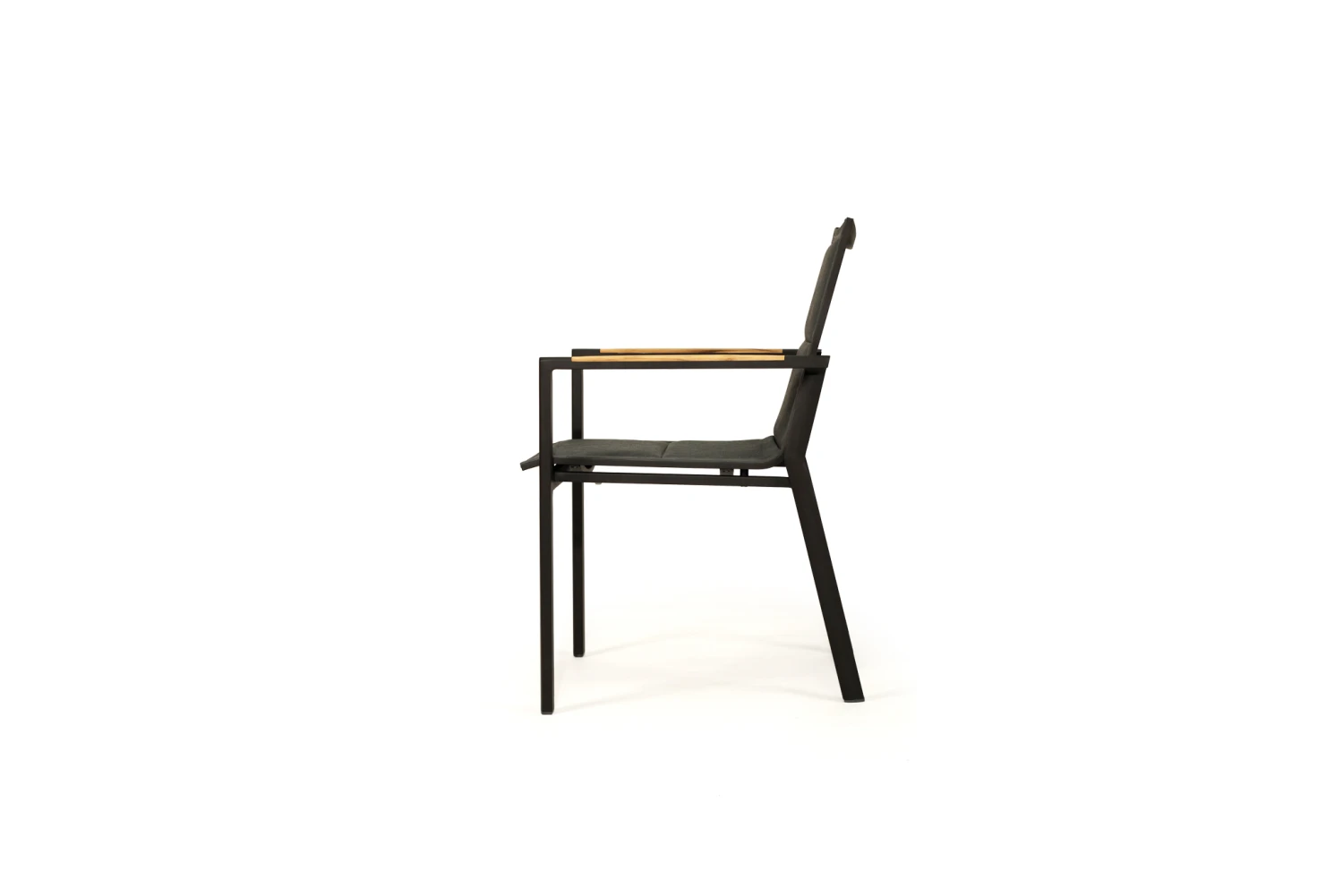 The frame is built from strong, powder-coated square aluminium tube and features a durable and comfortable PVC coated sling with double padding on the seat and back. The arm rests are inlaid with Teak accents.