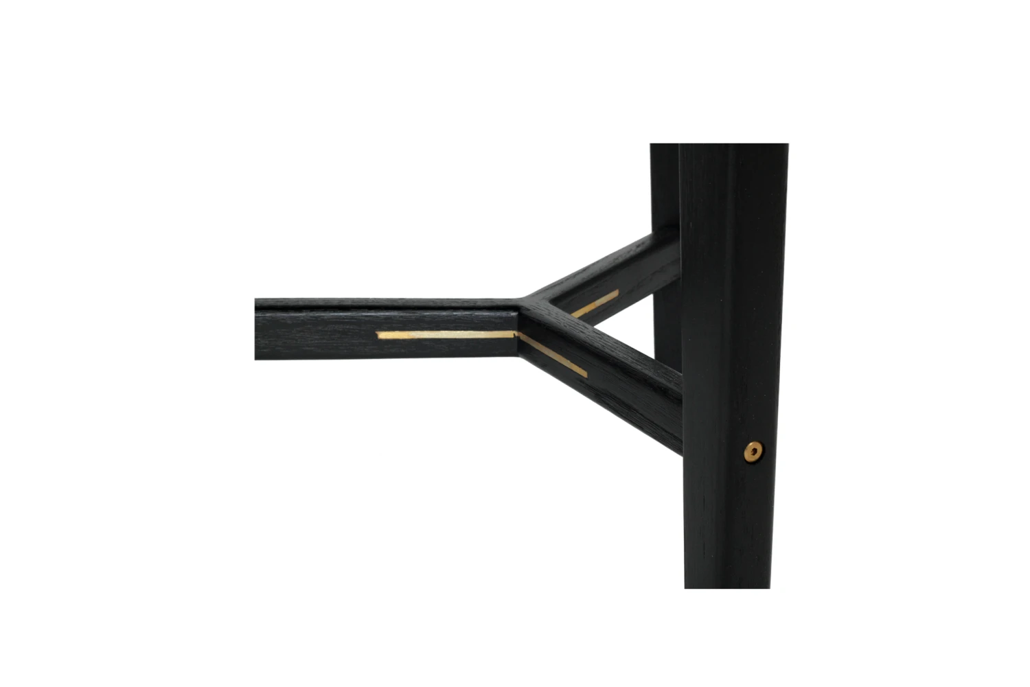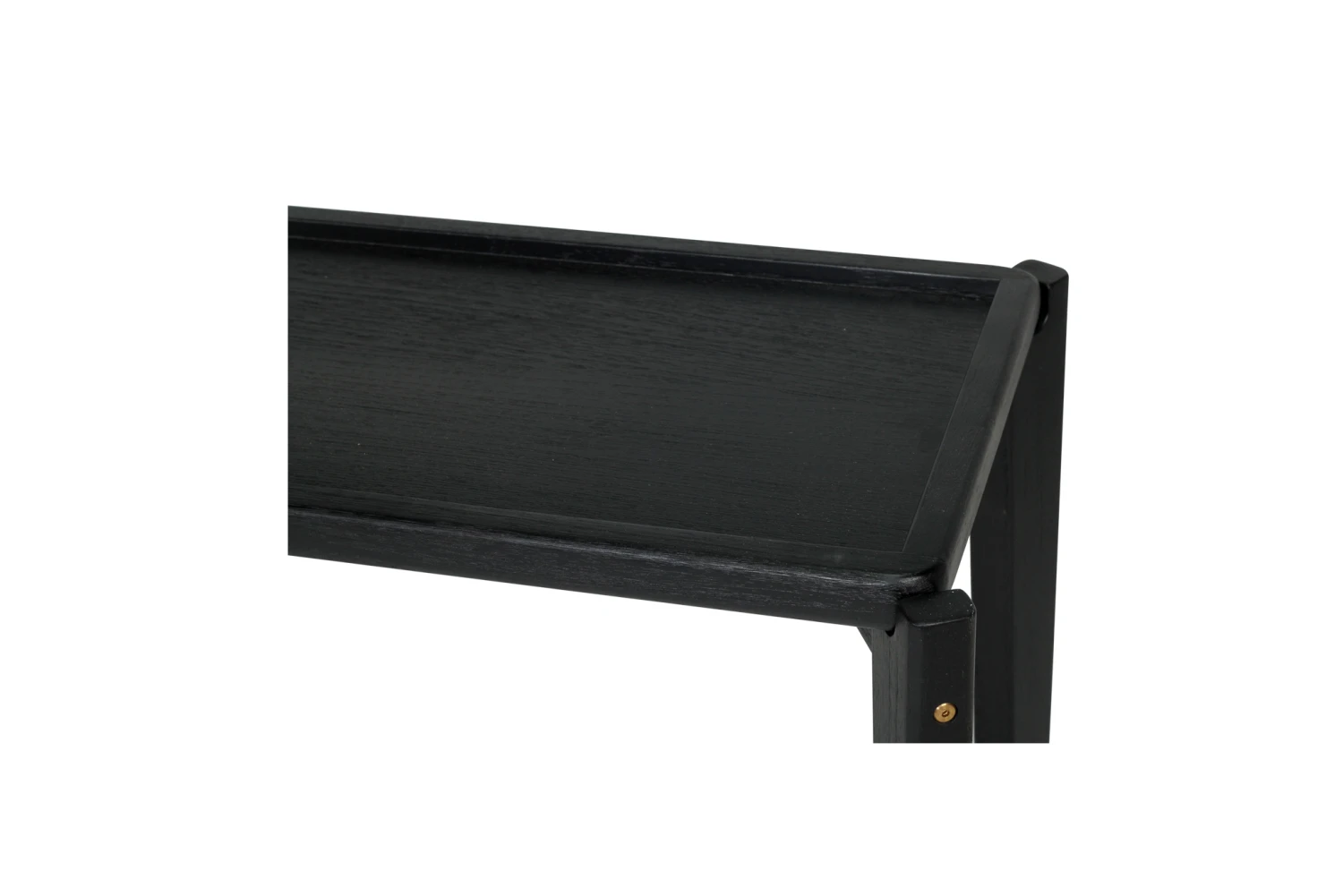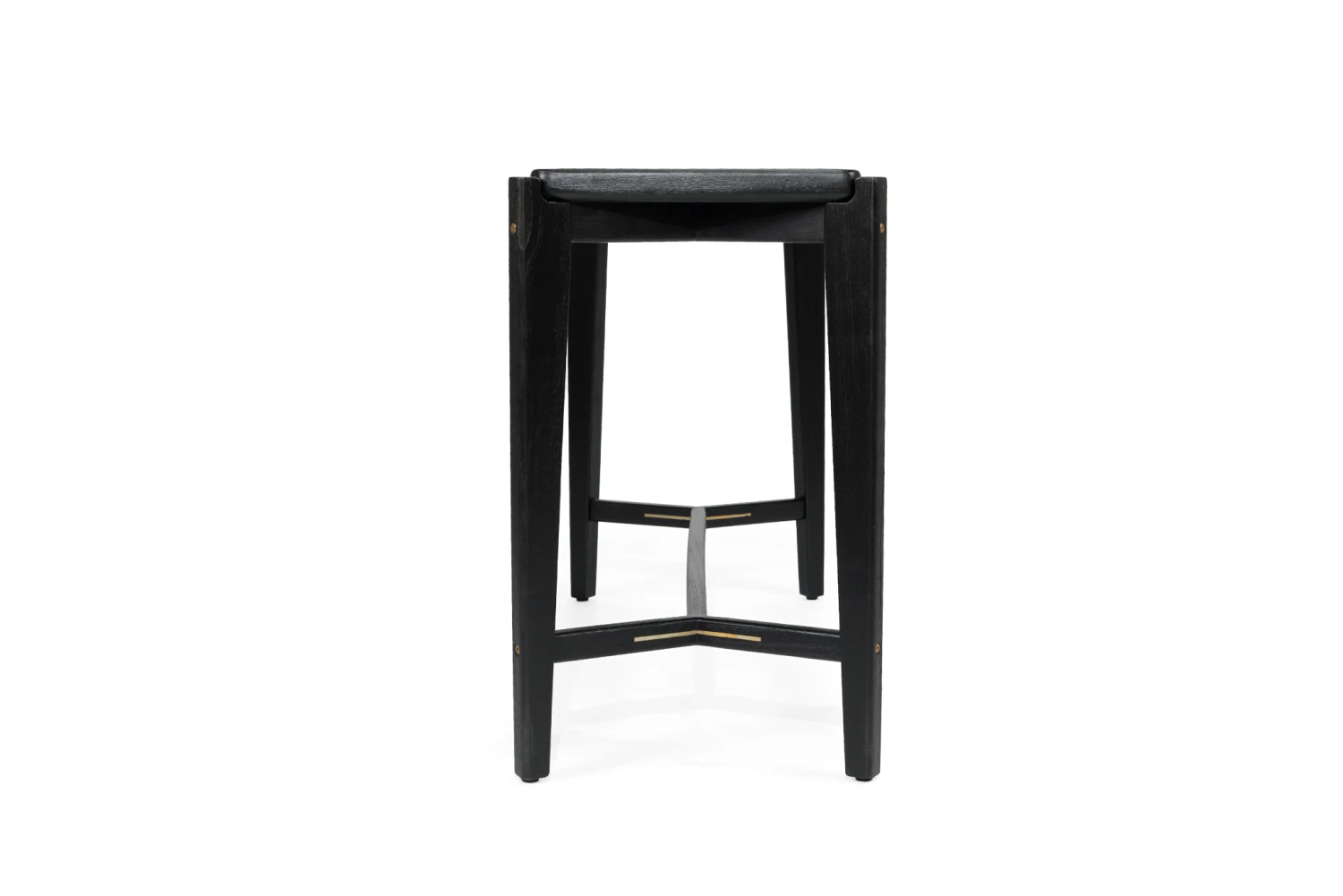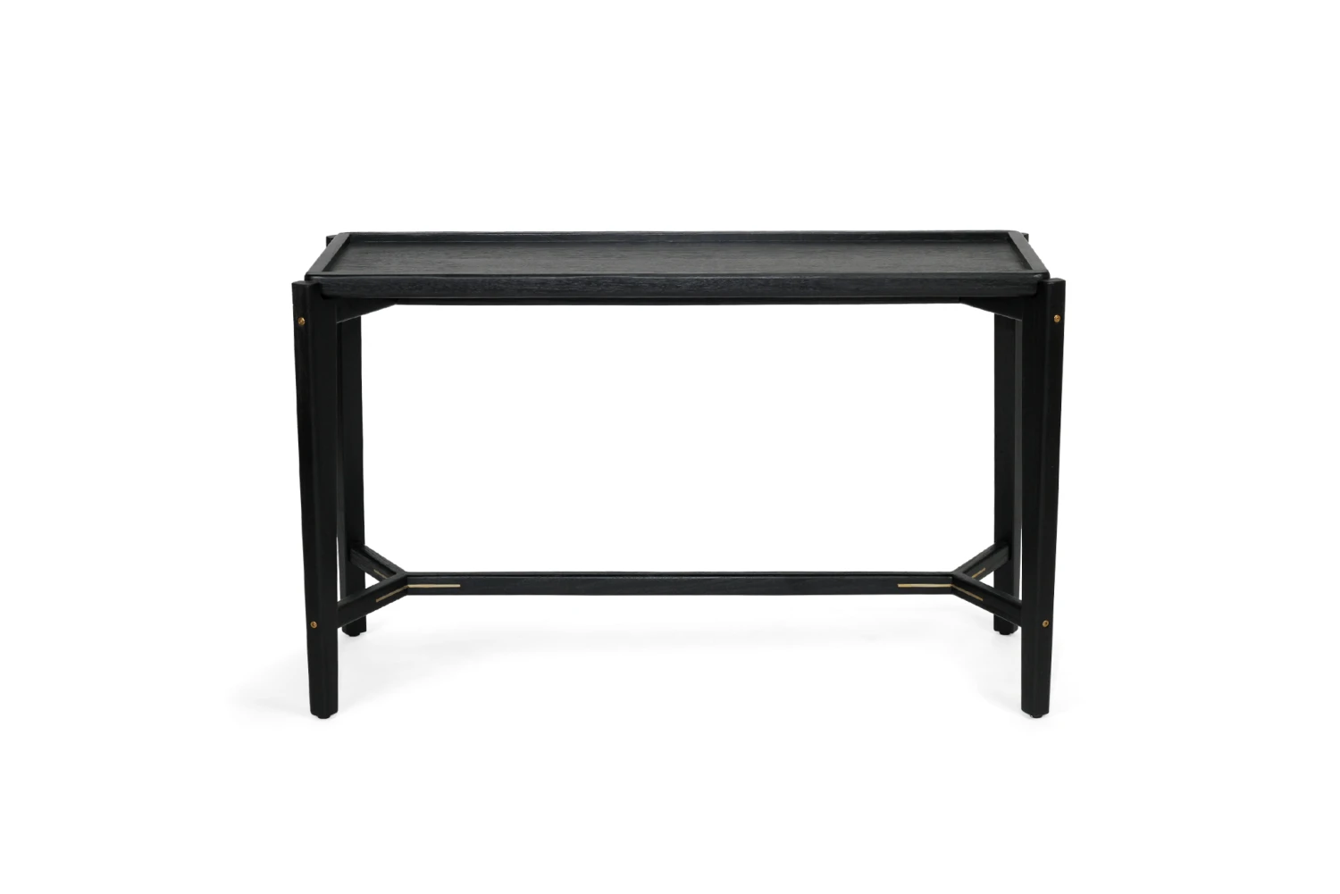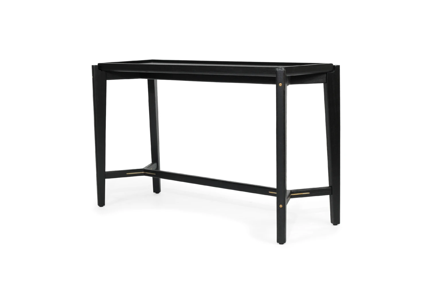 Crafted from solid teak wood, the Ruben Console Table features curved edges and a subtle brass accent. Finished in Black.