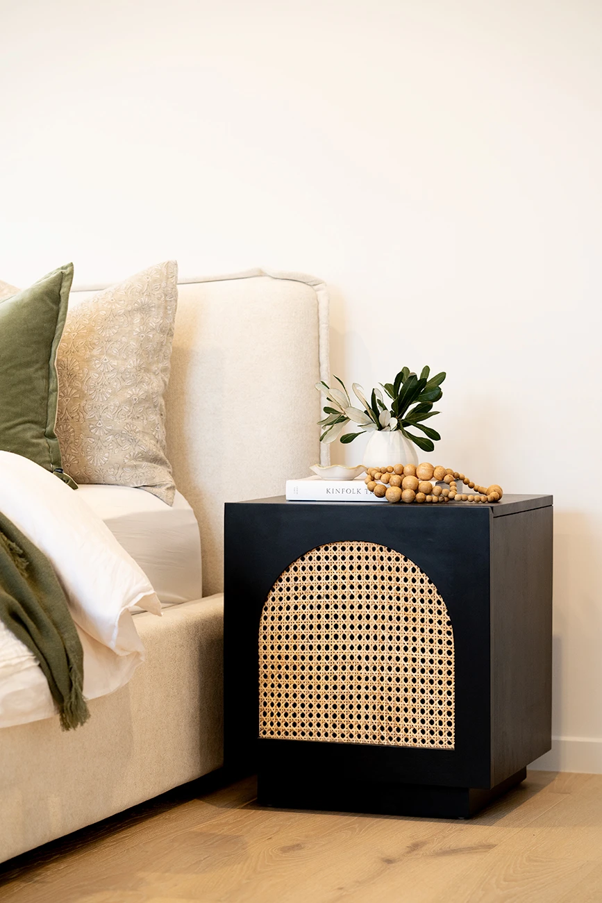 The Ryan Bedside Table is constructed from Mahogany wood and has a smooth black finish. It has 1 large opening door.