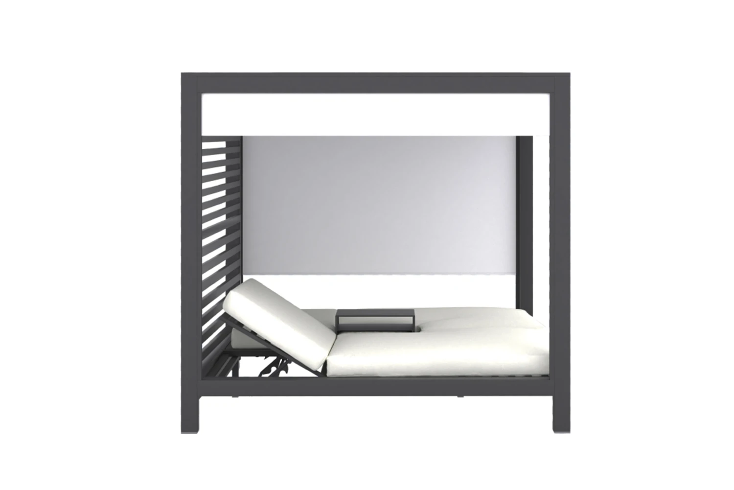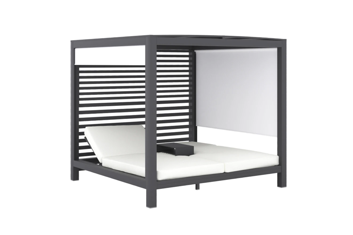 The Santorini Double Daybed is the ultimate luxe pool side private villa set up that is perfect for private and relaxing moments that make life amazing. Perfect for high end homes and resorts, the Santorini features two generous size, comfortable daybeds side by side. A four post powder coated frame with fixed plantation shutters to allow privacy and sun protection. The sides of the double daybed are easily closed or opened to secure privacy, sun protection and visibility.