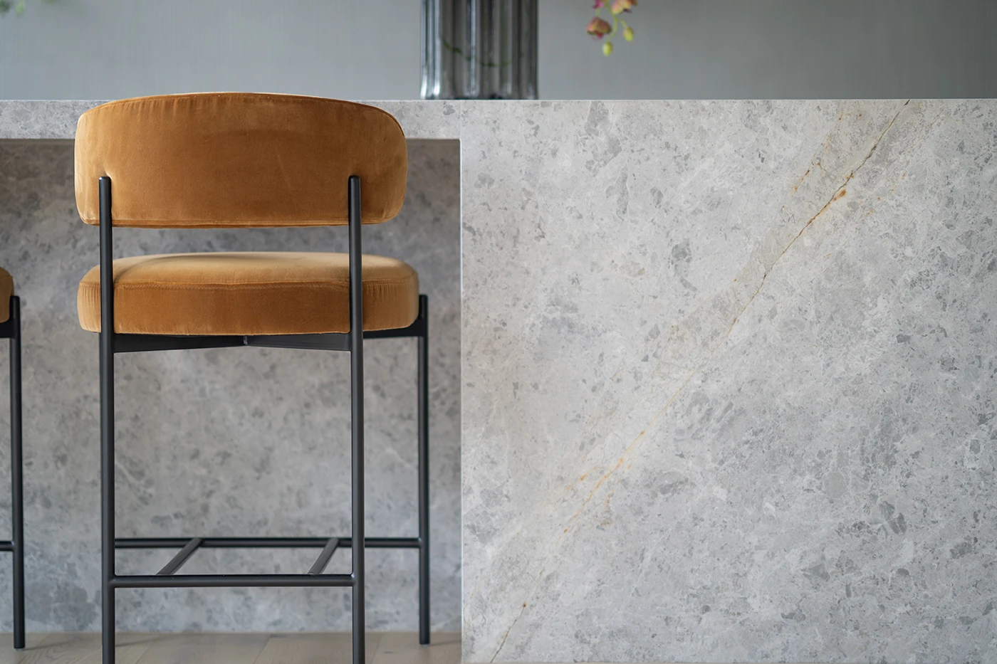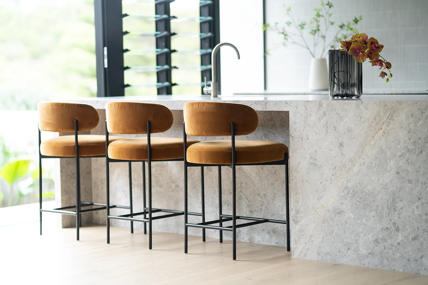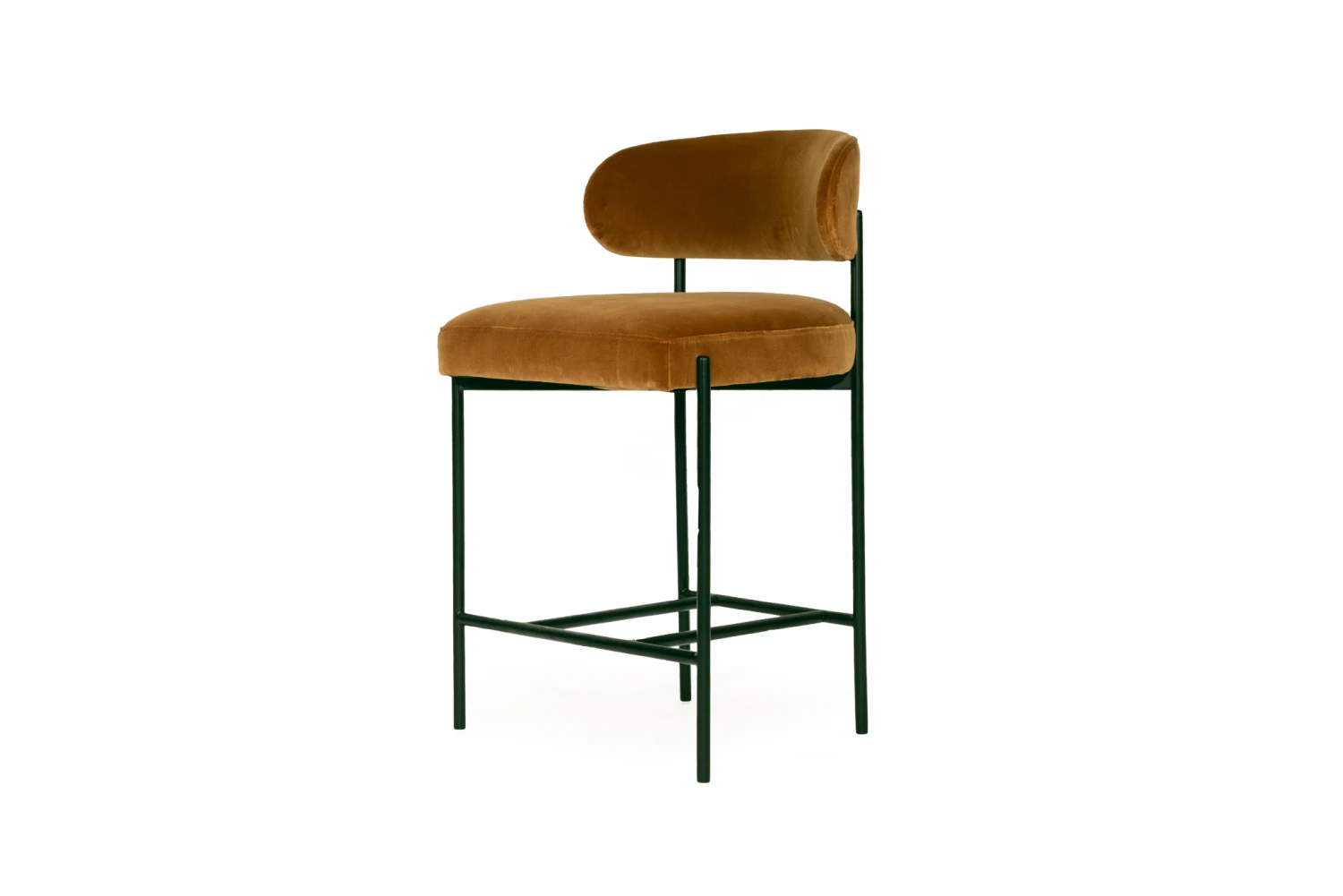 Inspired by art deco design, the Soho Counter Stool is a stunning addition to any dining room. Features a modern half-moon back design with sleek metal legs and finished with premium performance rust coloured velvet upholstery.