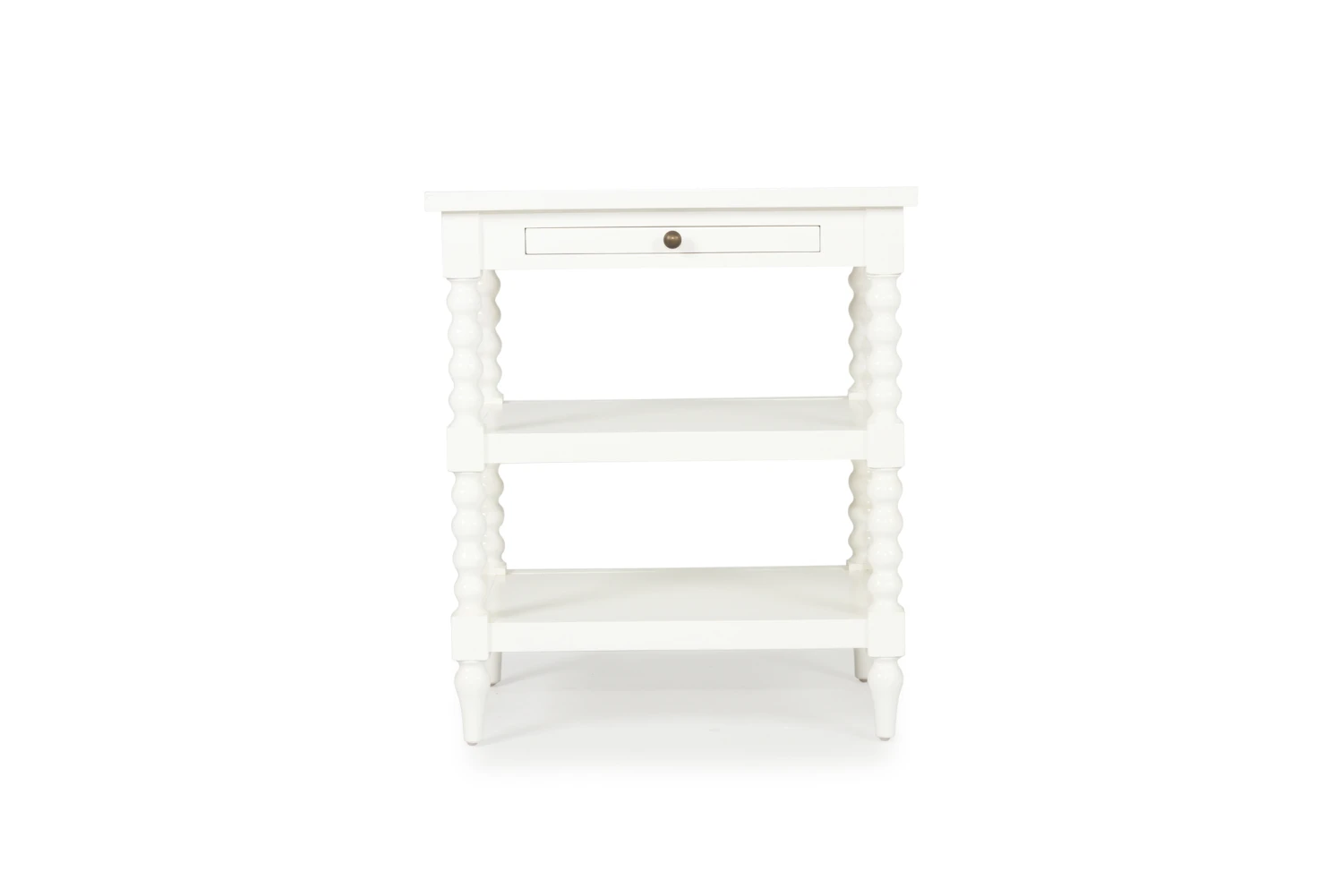 The Stradbroke Bobbin Bedside table is a large coastal inspired bedside table featuring four carved bobbin legs set in a bobbin frame. A simple brass knob complements a shallow drawer perfect for keeping small items.