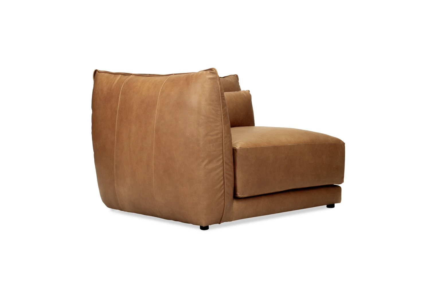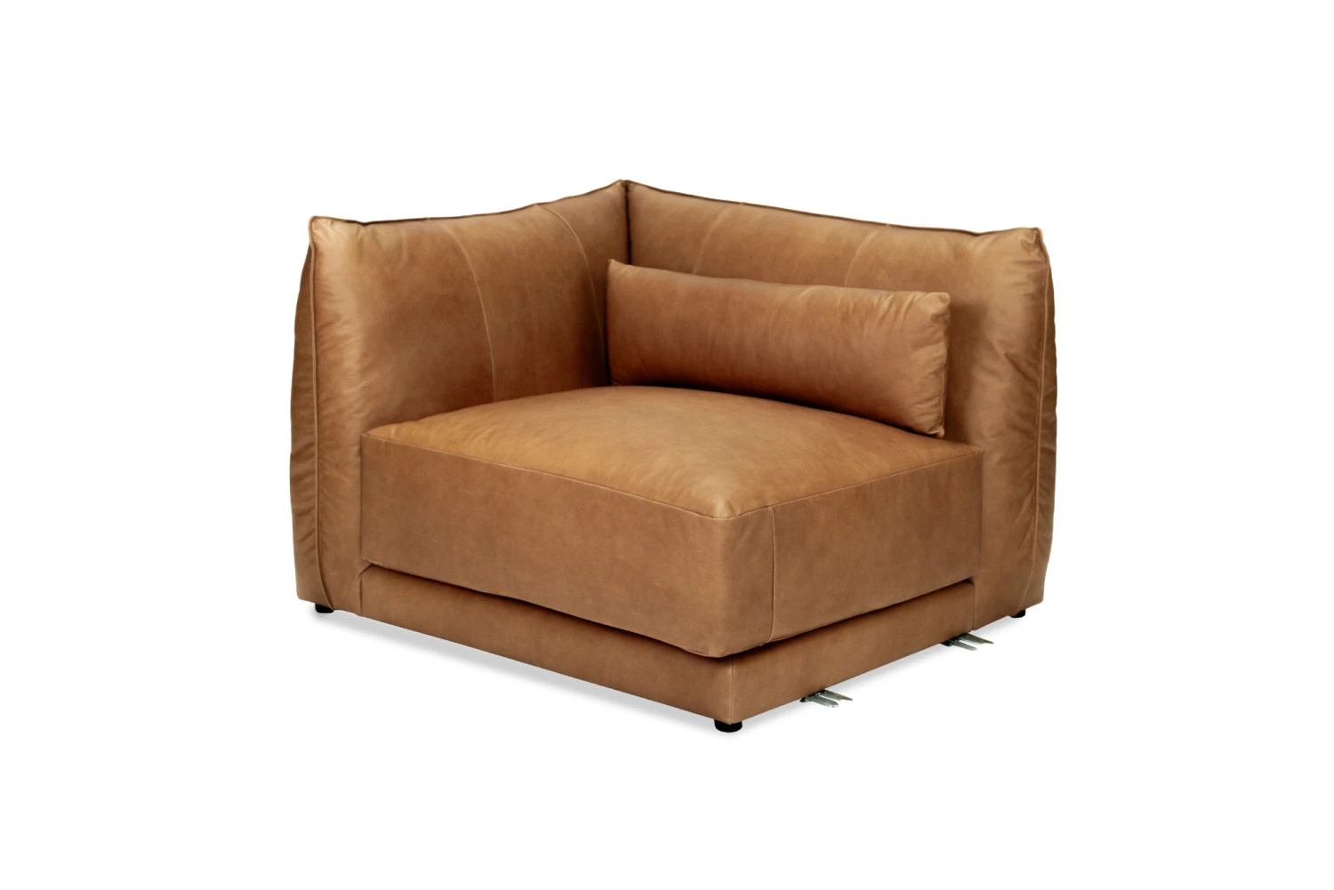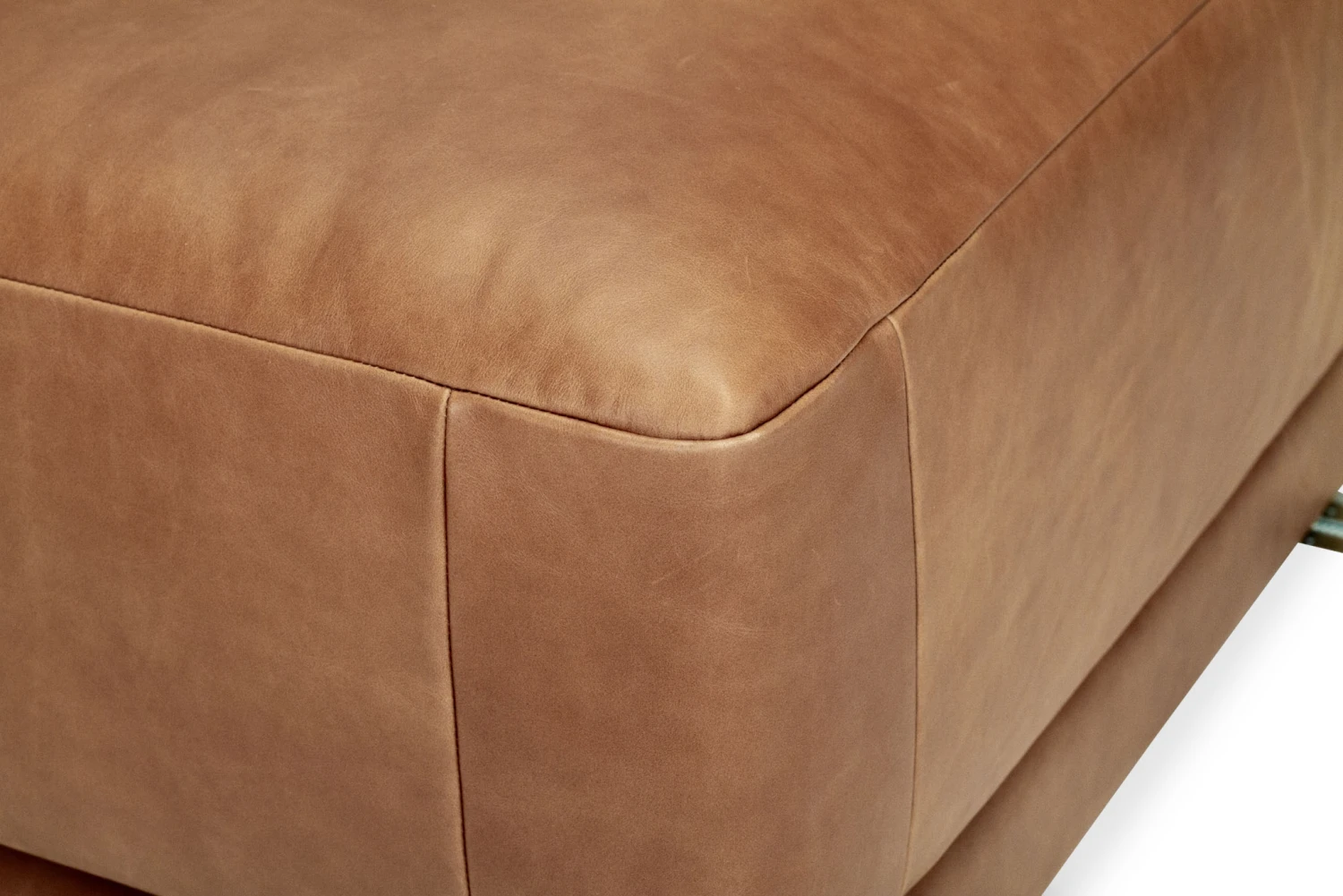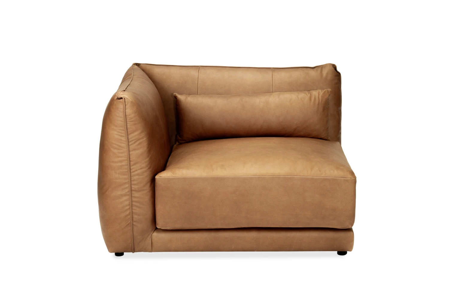 Finished here in Trends Saddle Leather, the Sunday Modular Sofa is also available in Linen Blend fabric or Ivory Boucle fabric.