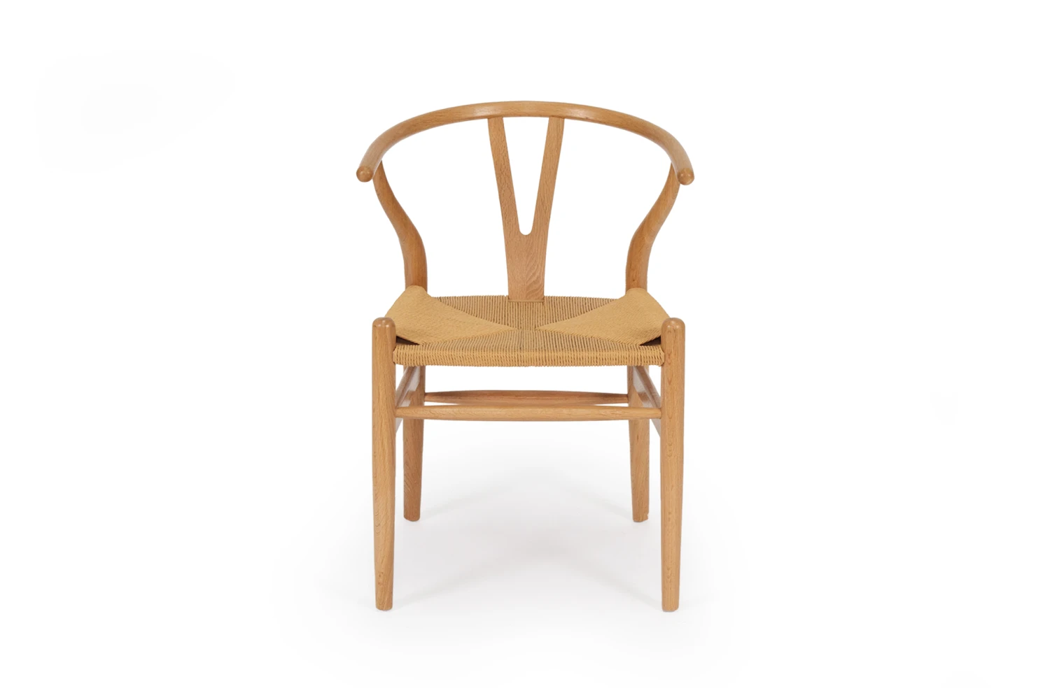 The Wishbone designer chair is a replica of the original Hans J Wegner CH24 Wishbone chair designed in 1950. The iconic design was inspired by portraits of Danish merchants sitting in Chinese Ming Dynasty chairs. It combines top rails and arms into a single piece with a characteristic Y-shaped back which provides comfortable support while giving stability to the steam-bent top. A natural paper cord base provides additional comfort and style whilst the tapered legs are an additional asset of the chair.